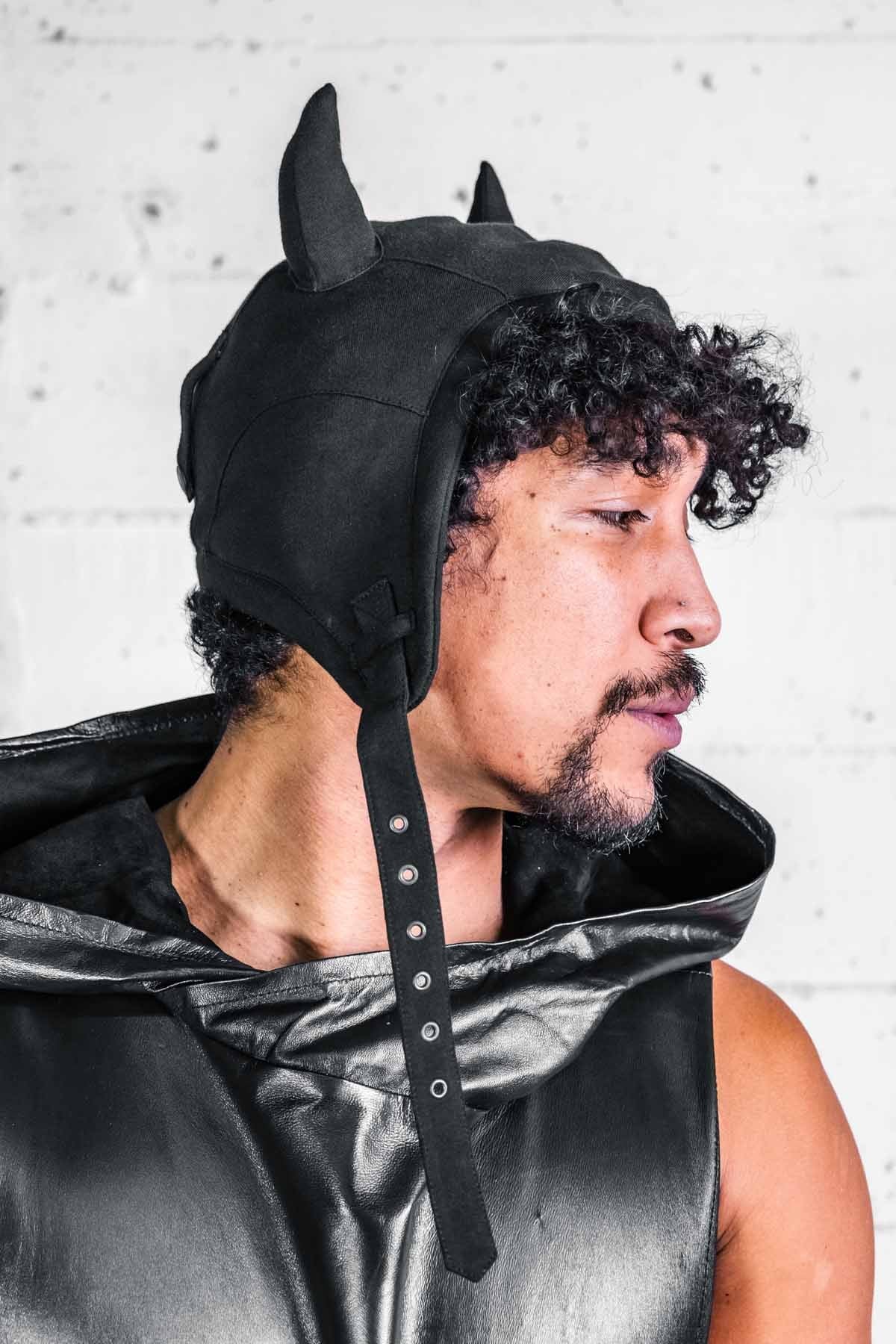 Designed in a traditional flight helmet style with peaked front, straps to hold goggles on and sewn on devil horns.