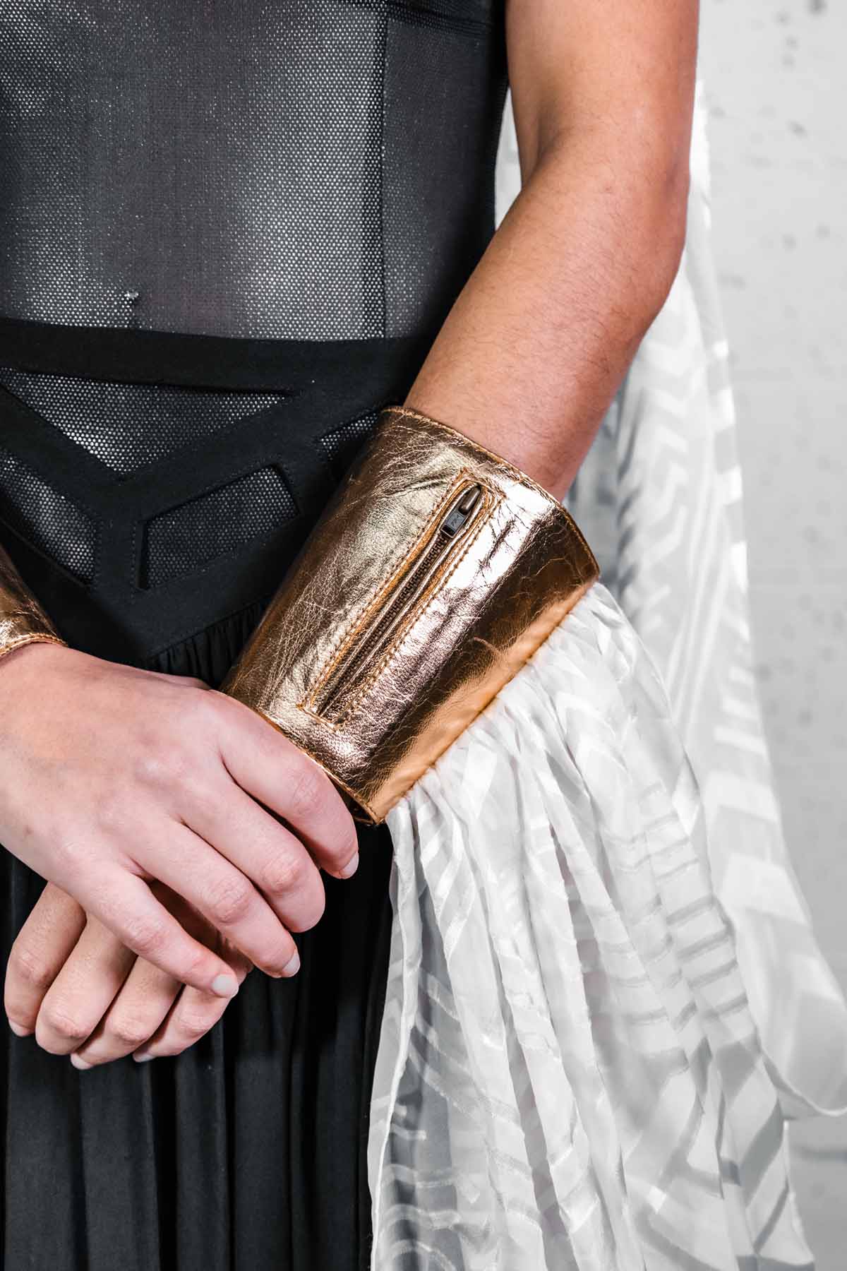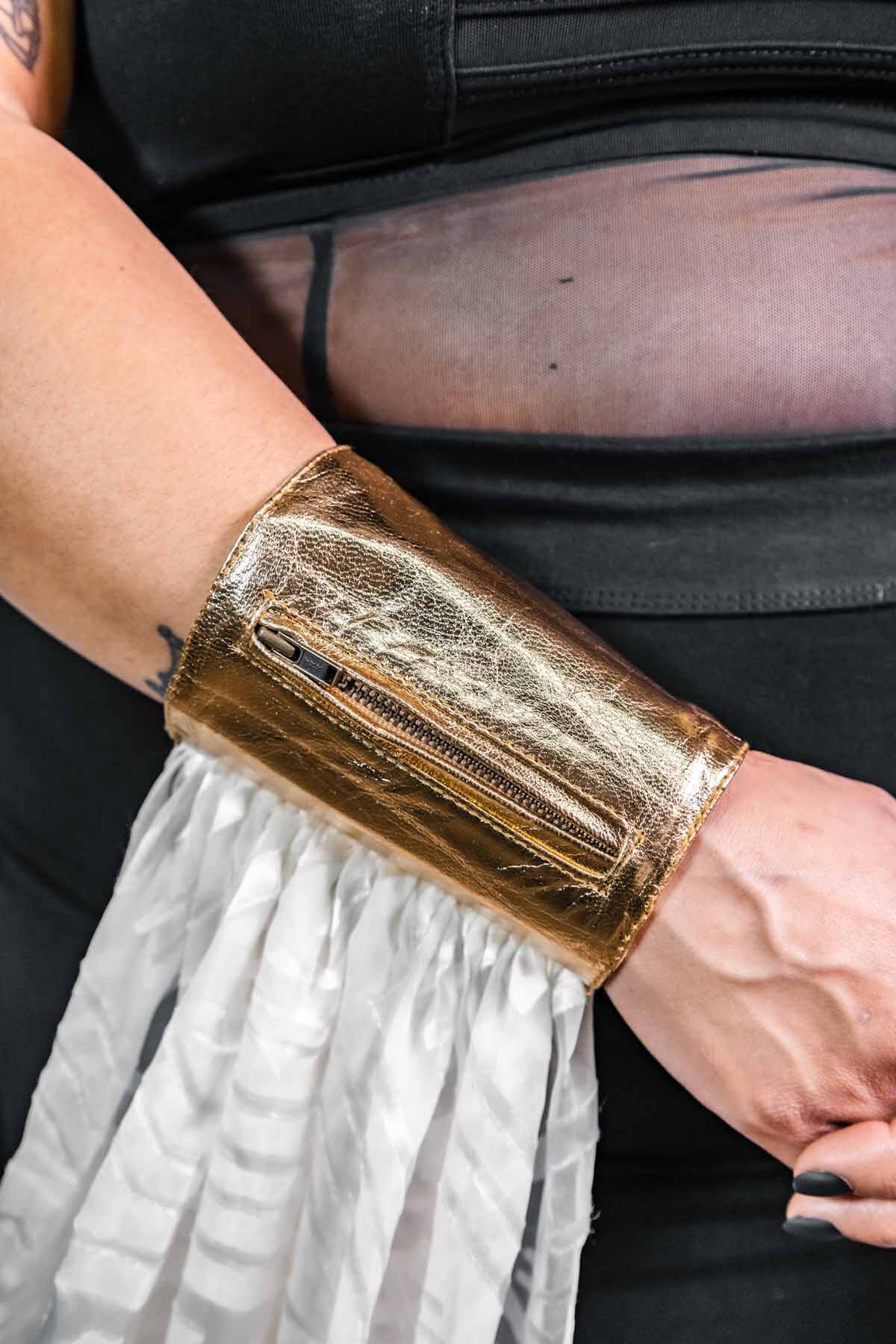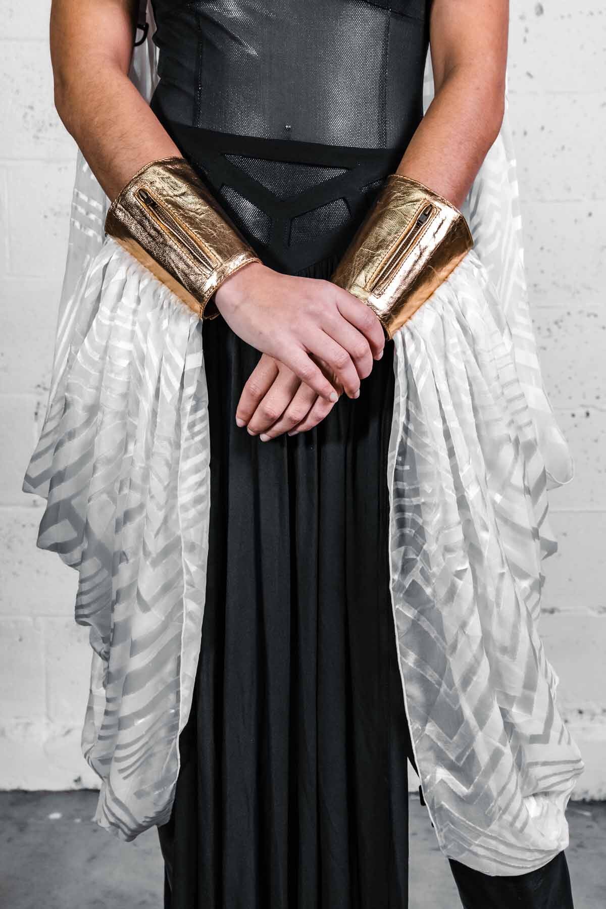 - Cuffs snap on and feature zipper pockets