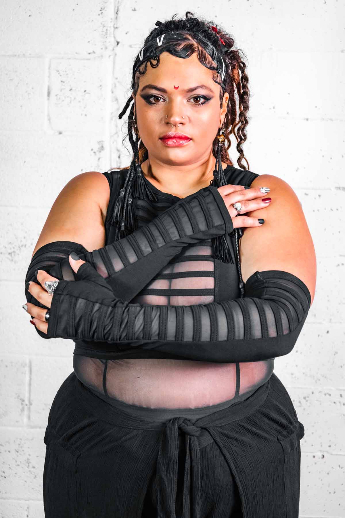 Elbow-length, fingerless cotton gloves/arm warmers - doubles as sleeves to keep toasty! Wear them under gauntlets, wear them with t-shirts, wear them with your festival outfit, wear them long or slouchy. Silicone inside the top to help them stay up. Cotton and mesh combine with sewn on cotton stripes over mesh details down the front panel.