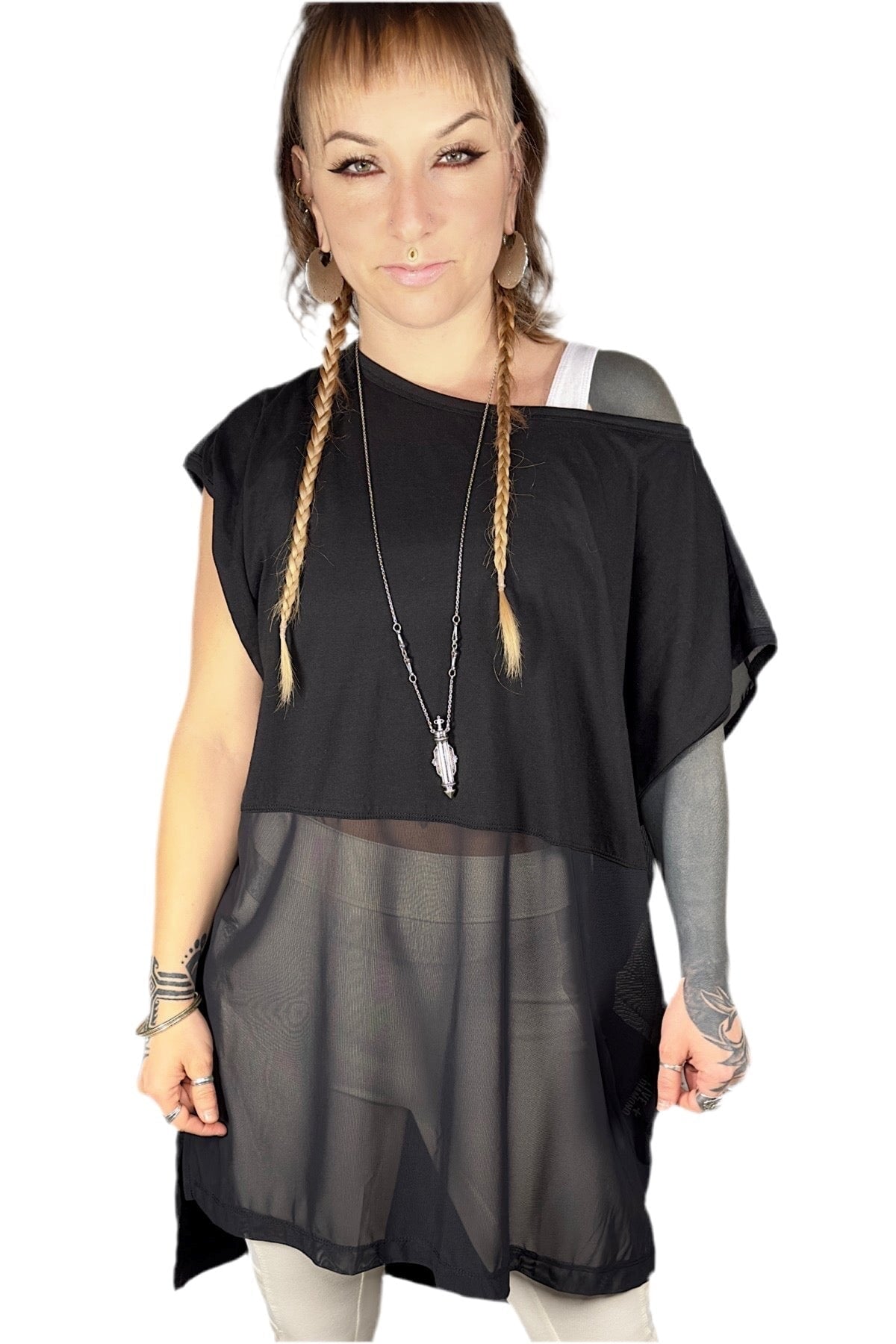 Half Mesh Oversize Top. Comfy soft cotton mixed with sheer mesh. Wear it either direction with the sheer top in the front or back. A hi lo cut, front top is cotton, front bottom is mesh, back top is mesh, back bottom is cotton.