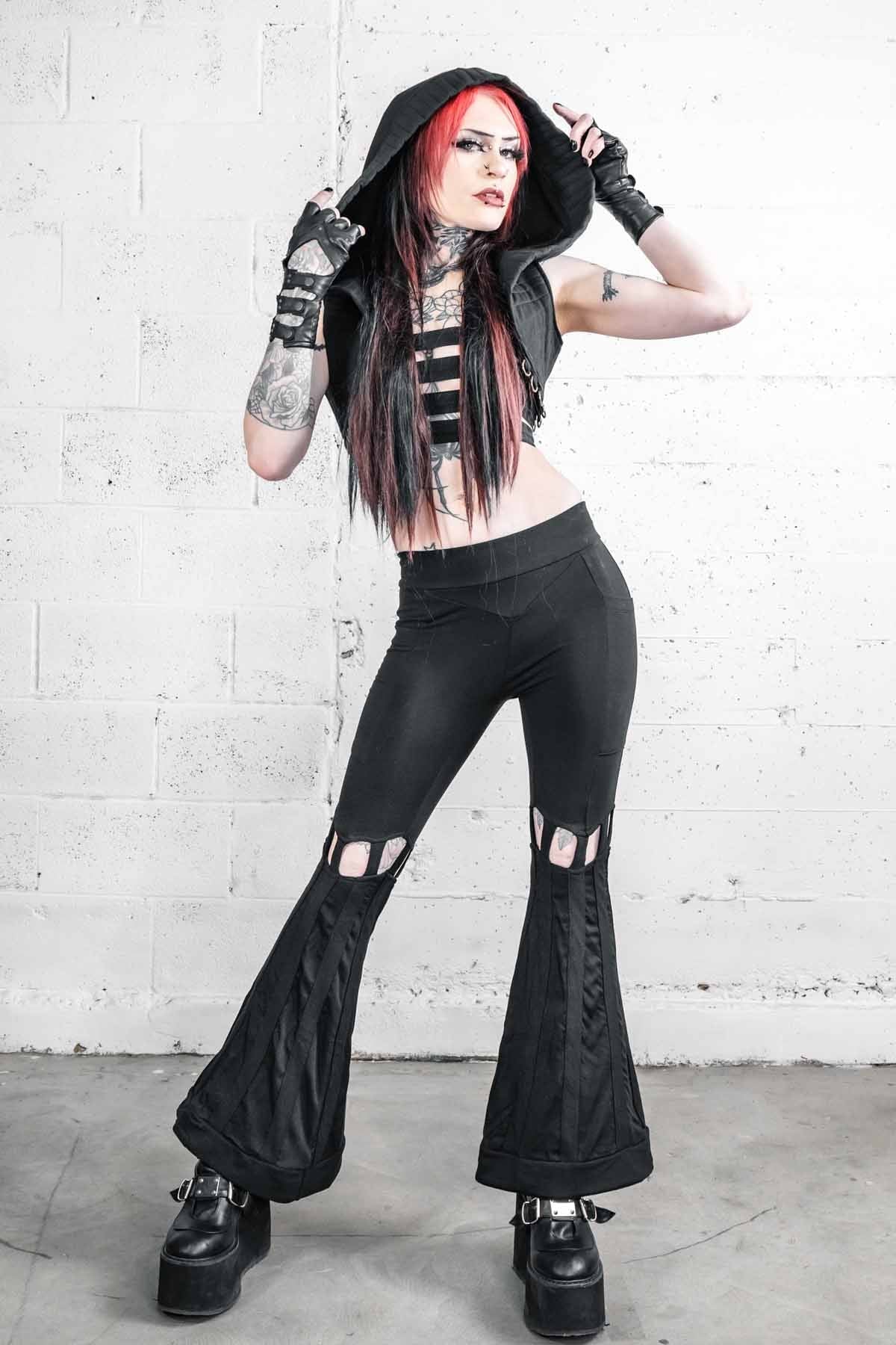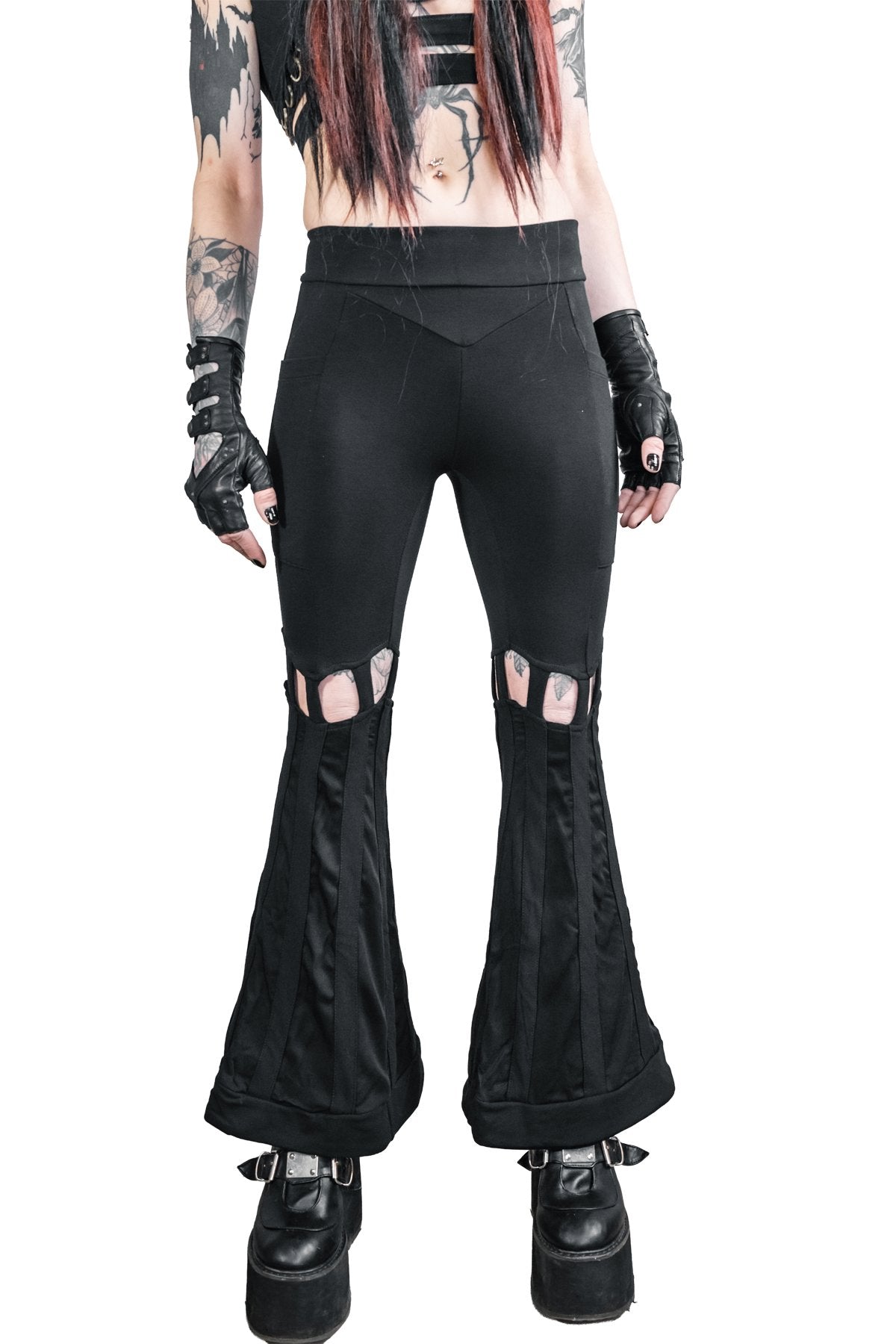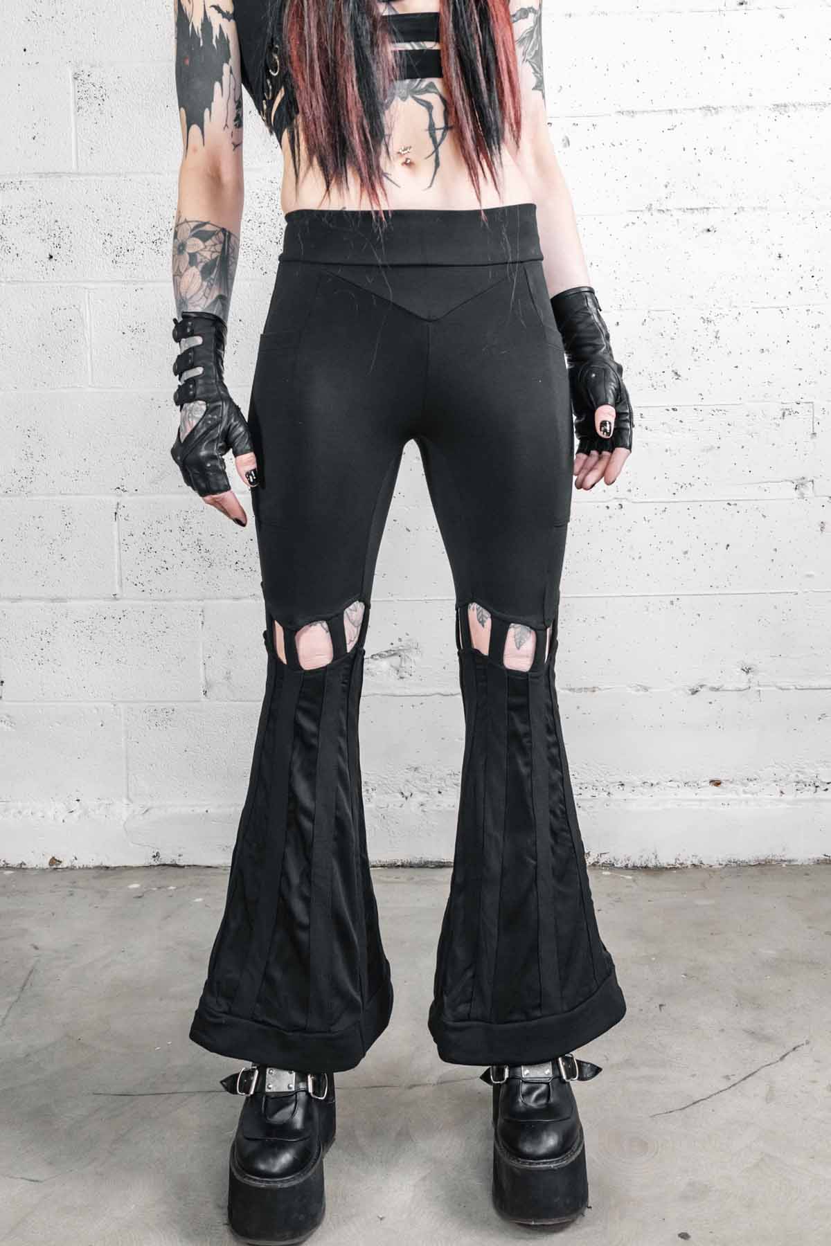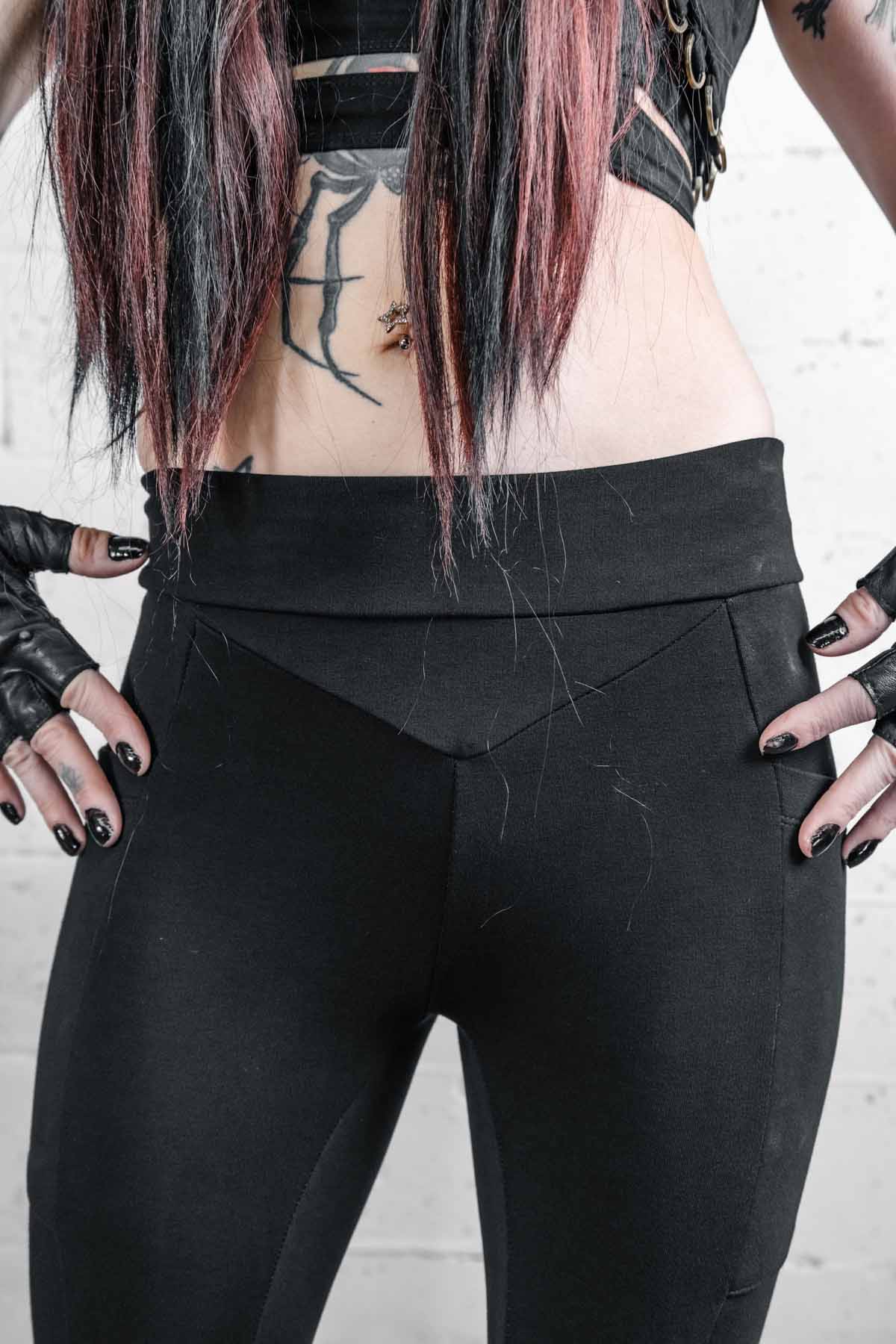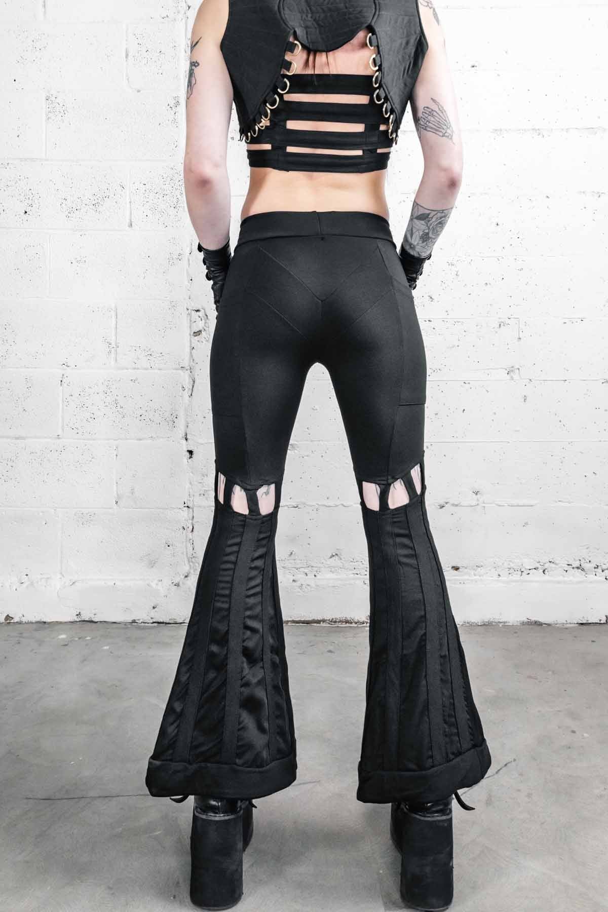 High waist Bell bottom pants made from a luscious, think, supportive Bamboo Baby Terry Spandex fabric with accent details in the bell bottoms made from a Bamboo Baby Twill. Two pockets, one on each side fits your phone and sewn into the seams of the pants for strength. Cage details above the knee with a flowy fabric in the bells and a more sturdy stripe down the entire bell. Flattering chevron yoke on the front and back panels. Elastic at the top to help them stay put.