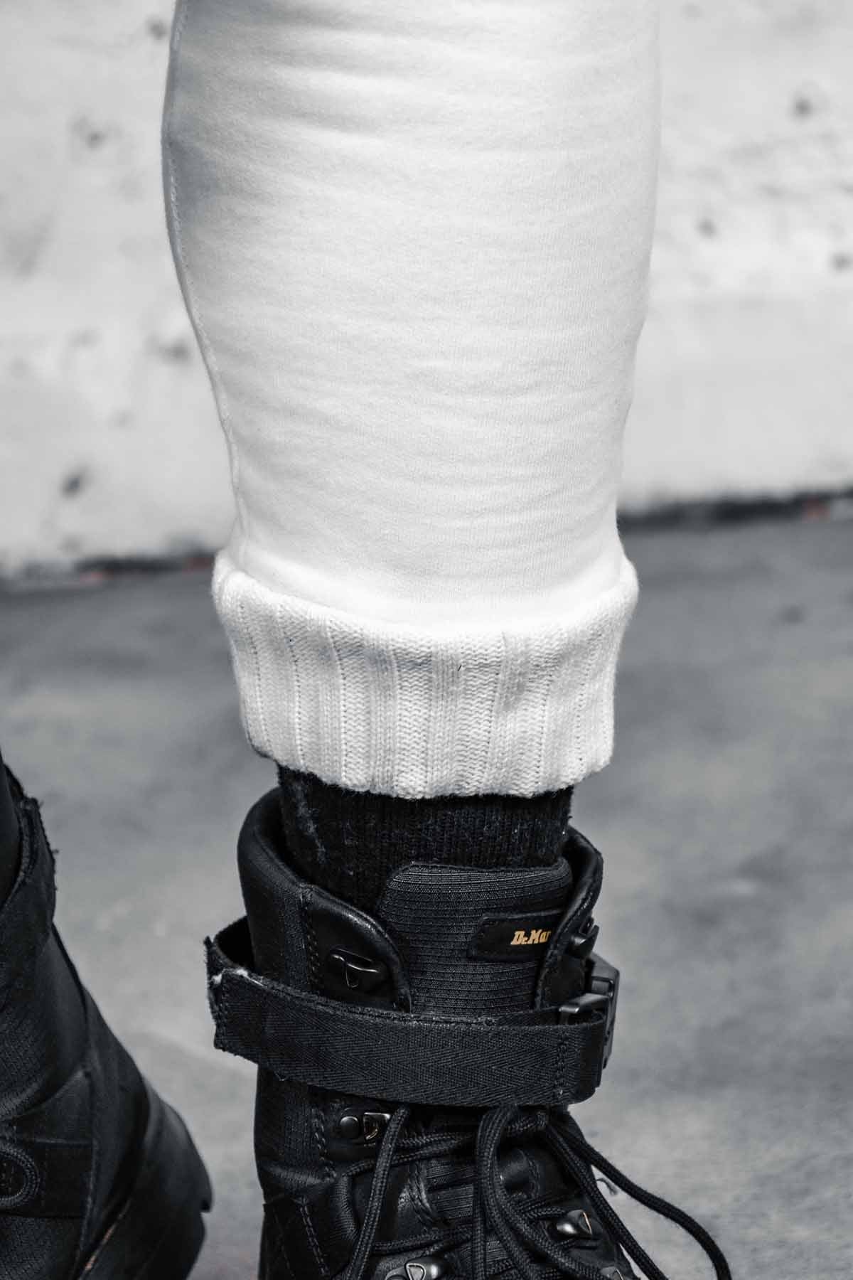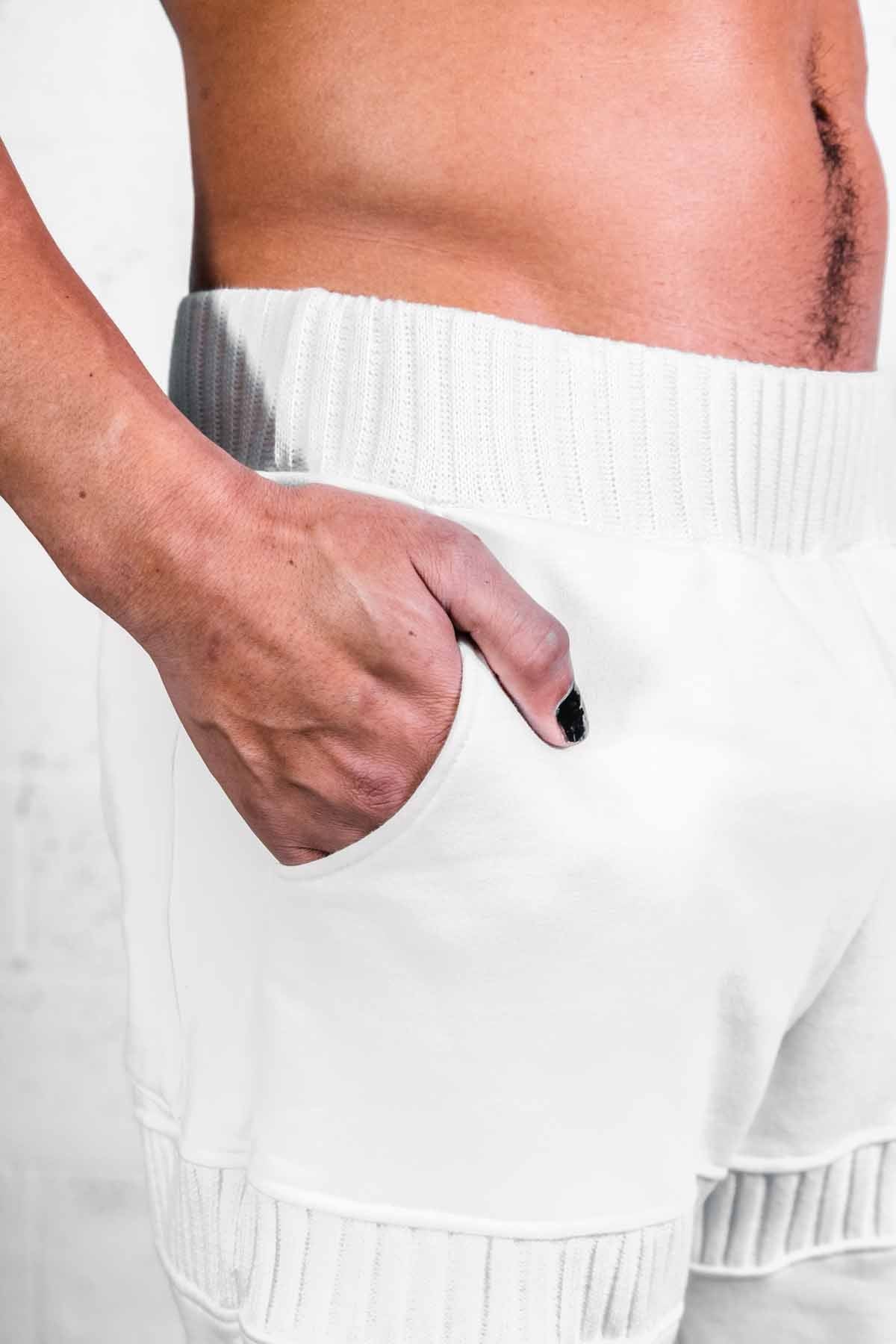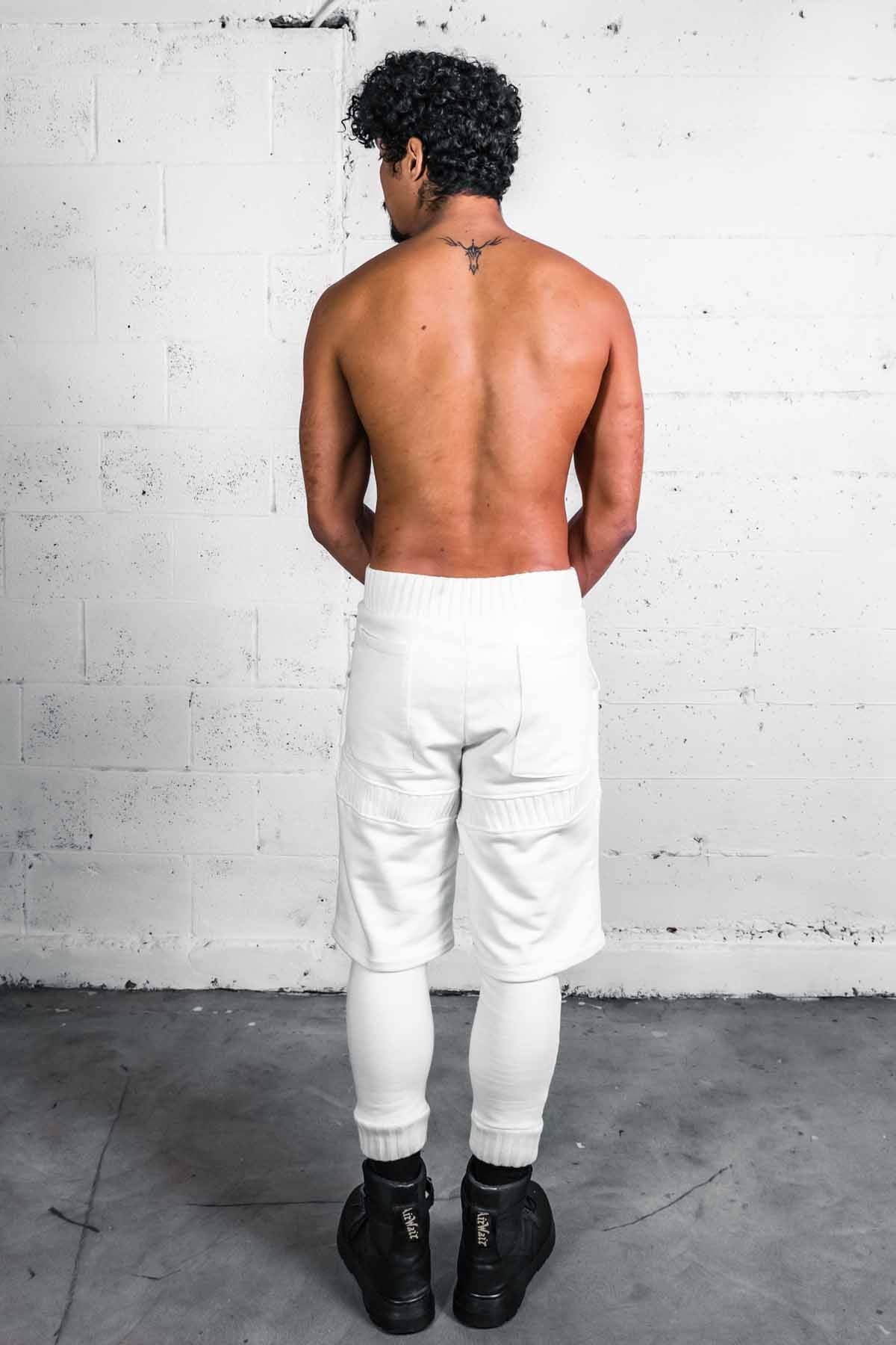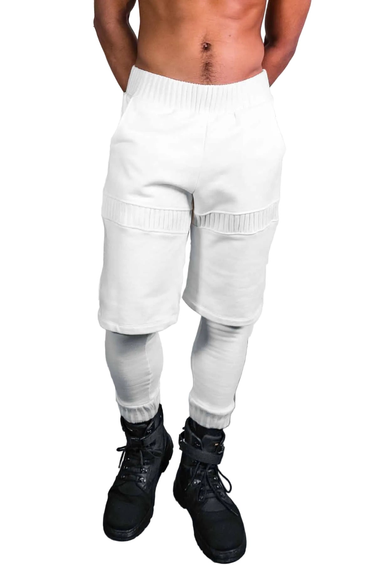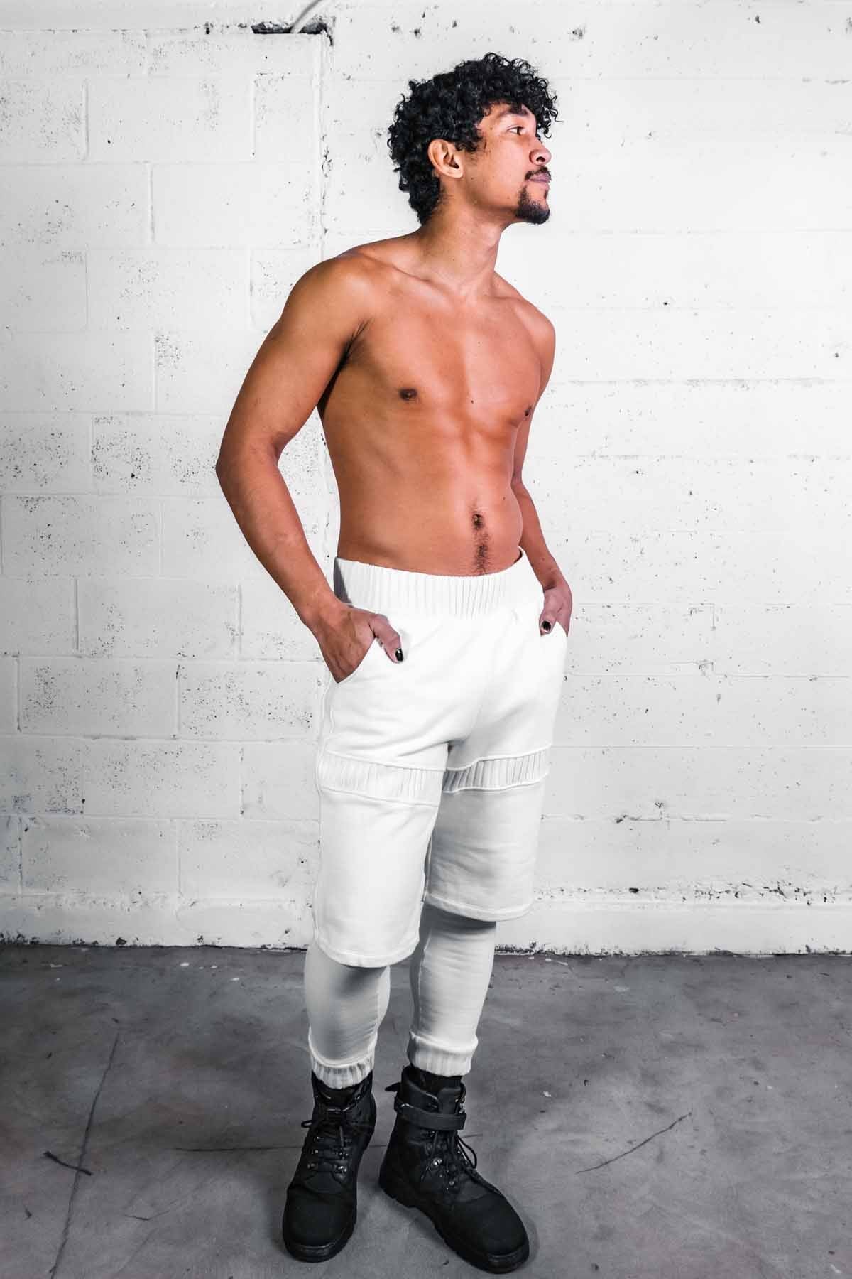 An attached leggings and shorts combo, made from cotton baby terry main fabric with a thick cotton rib accent, 2 front pockets, 2 back pockets, elastic waist with drawstring support.
