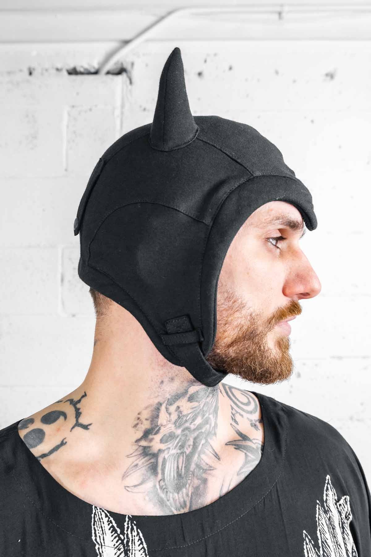 Designed in a traditional flight helmet style with peaked front, straps to hold goggles on and sewn on devil horns.