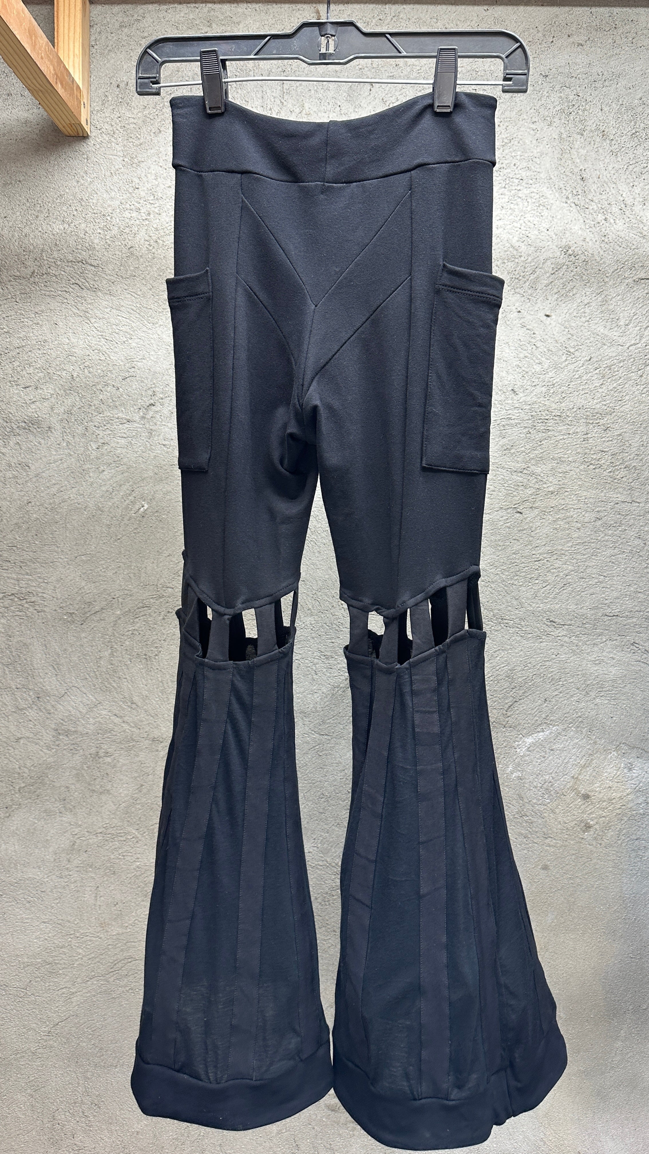 High waist Bell bottom pants made from a luscious, think, supportive Bamboo Baby Terry Spandex fabric with accent details in the bell bottoms made from a Bamboo Baby Twill. Two pockets, one on each side fits your phone and sewn into the seams of the pants for strength. Cage details above the knee with a flowy fabric in the bells and a more sturdy stripe down the entire bell. Flattering chevron yoke on the front and back panels. Elastic at the top to help them stay put.