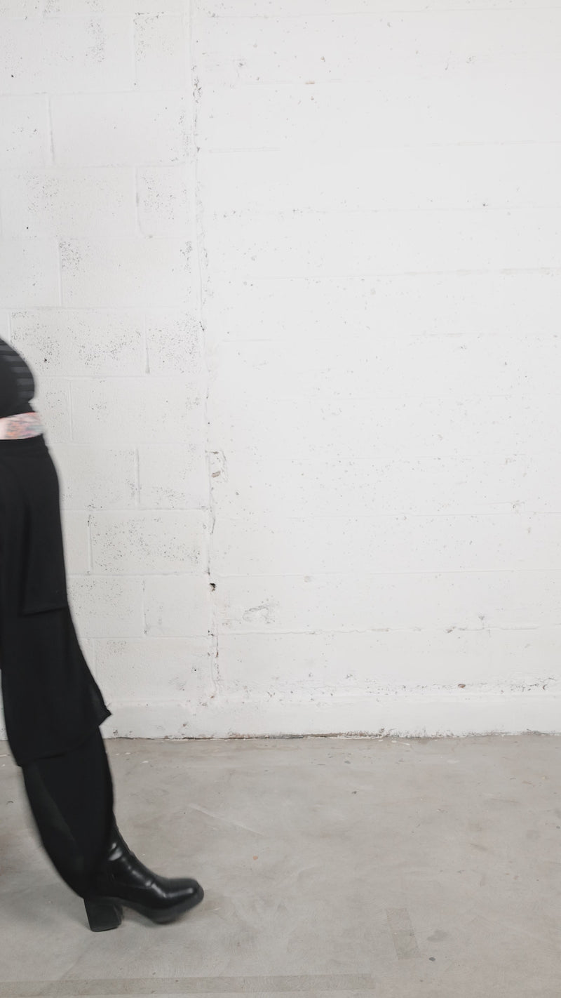 Panel Skirt with three layers of fabric going down the front and back. Elastic on one side and a tie string on the other side.